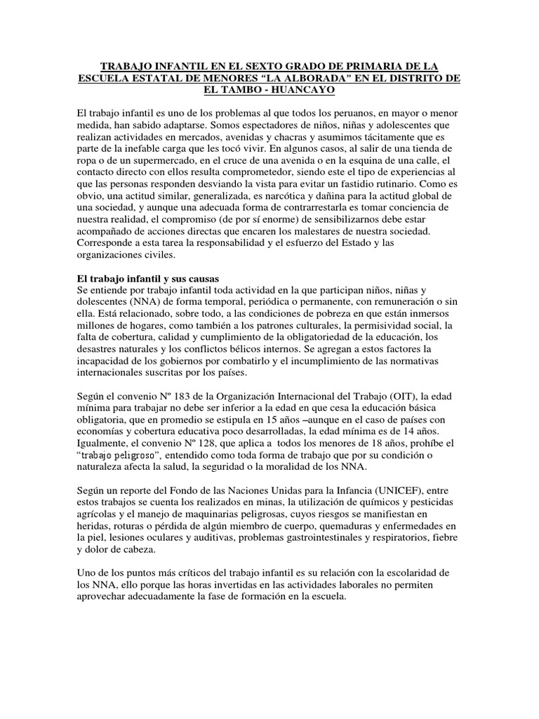 Resumen de trabajo infantil. Trabajo infantil estudio de opinin pblica en el per. El trabajo infantil se resume como la actividad realizada por los nios menores de 12 aos el cual es es realizado de manera retribuida o no retribuidaes decir aquellos nios que son enviados por los padres y se ven obligado a entregar el dinero ganado a estos.